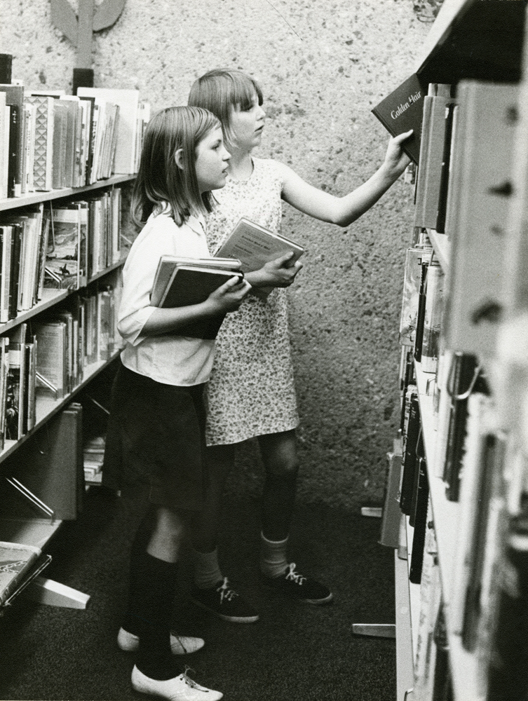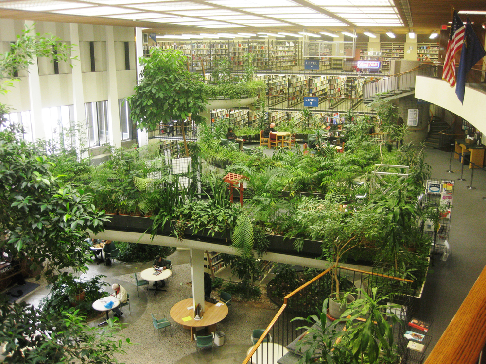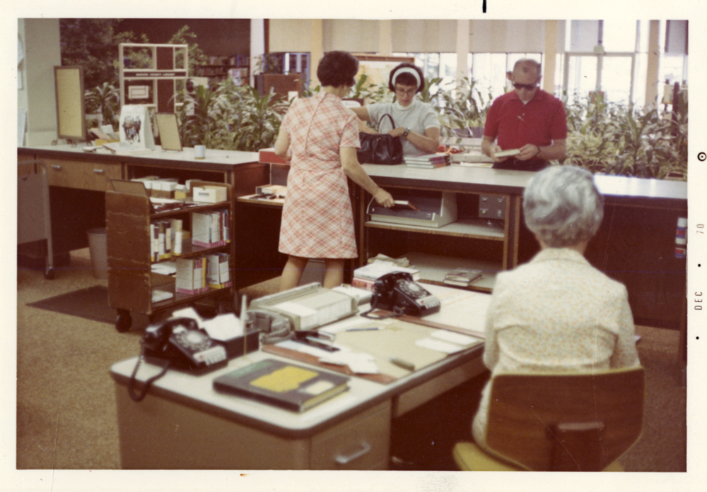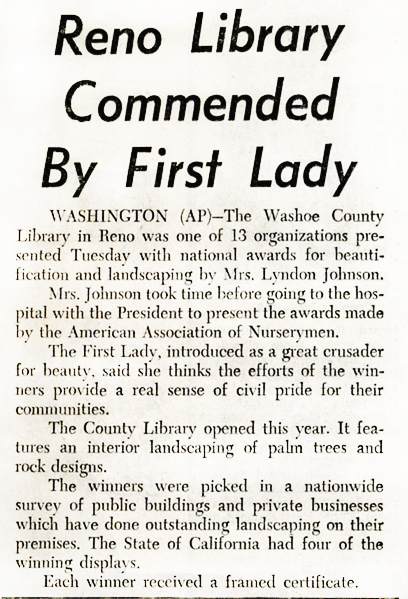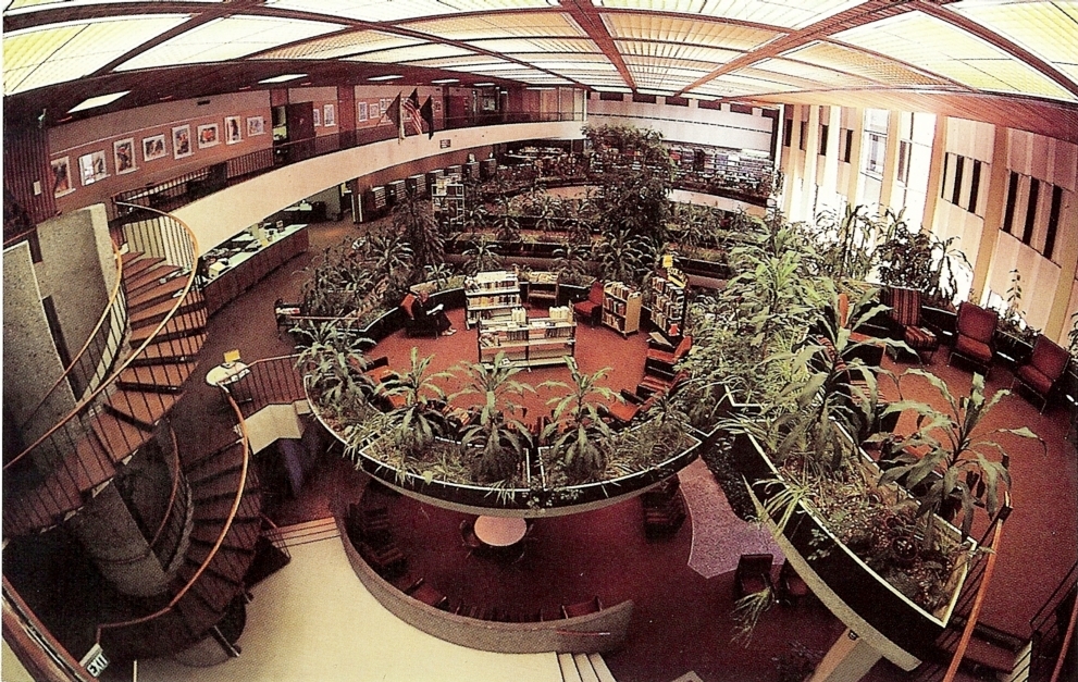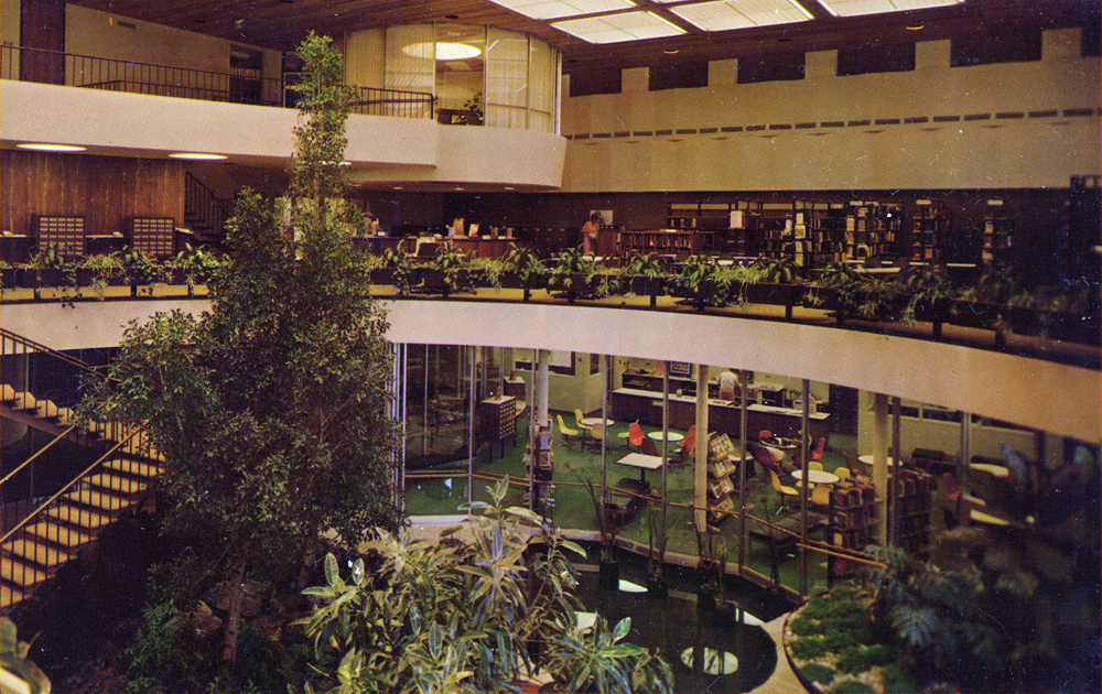 The library opened to the public on May 13, 1966. The dedication ceremony and an open house were held on May 22 with more than 700 people coming to view the exquisite and daring design. It was not long before Hewitt Wells was honored for his artistry. He received the Industrial Landscape Award from the American Association of Nurserymen for his interior use of hundreds of plants, shrubs, and trees gracefully arranged in huge iron planters along walkways of stones and mica schist. America’s First Lady, Mrs. Lyndon B. Johnson, presented the award as part of her Beautify America campaign.
