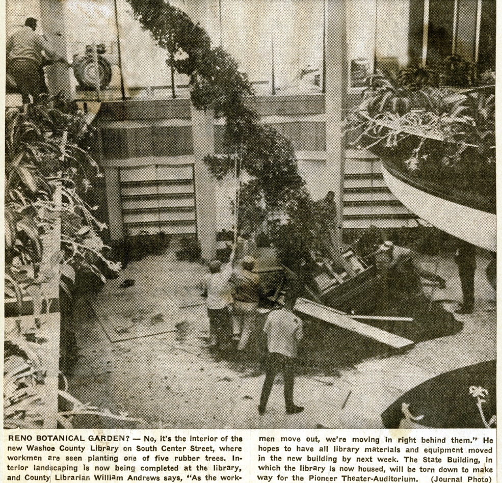 After the demolition of the Carnegie Free Public Library, the Reno branch of the Washoe County Library was housed in the Nevada State Building, which by the mid-1960s, was slated for demolition to make room for the Pioneer Theater and Auditorium. The newly established Fleischmann Foundation offered the library $1.2 million for the construction of a new building, and after a lengthy struggle, and the near loss of the donation, the city signed a 99-year lease on several parcels on South Center Street in December 1963. In June 1964, the Nevada State Journal reported that the county had approved the plans for the new library, and had issued requests for construction bids. The architect Hewitt C. Wells, of the firm DeLongchamps, O'Brien and Wells, submitted the winning design, which offered many unique interior features.