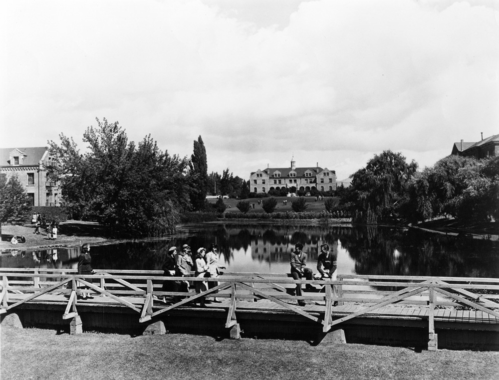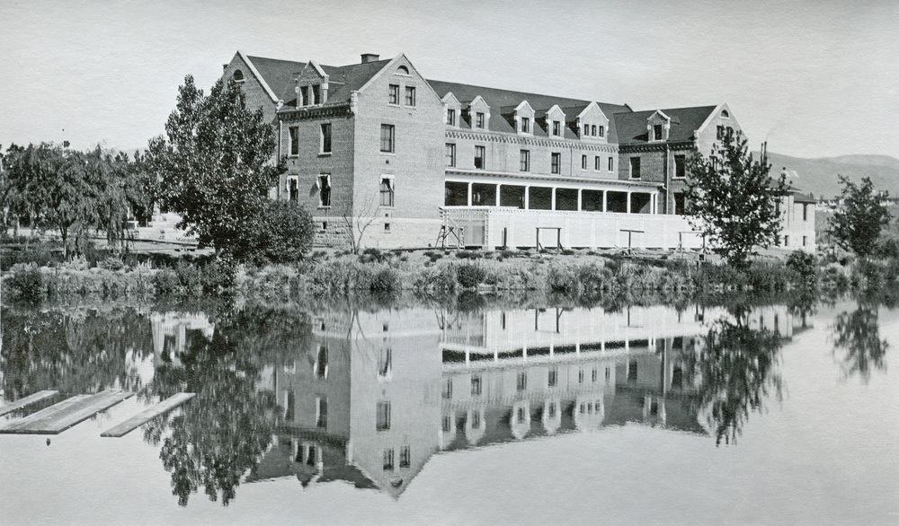 Manzanita Hall was just half its present size and L-shaped when first erected on the west edge of campus, on a parcel of fifteen acres newly purchased to expand the University. An addition constructed in 1910 added a mirror image of the original south arm of the building to the north side. A wooden porch, added to the east side around 1910, was removed during remodeling in the 1950s; the porch ghost is still visible.