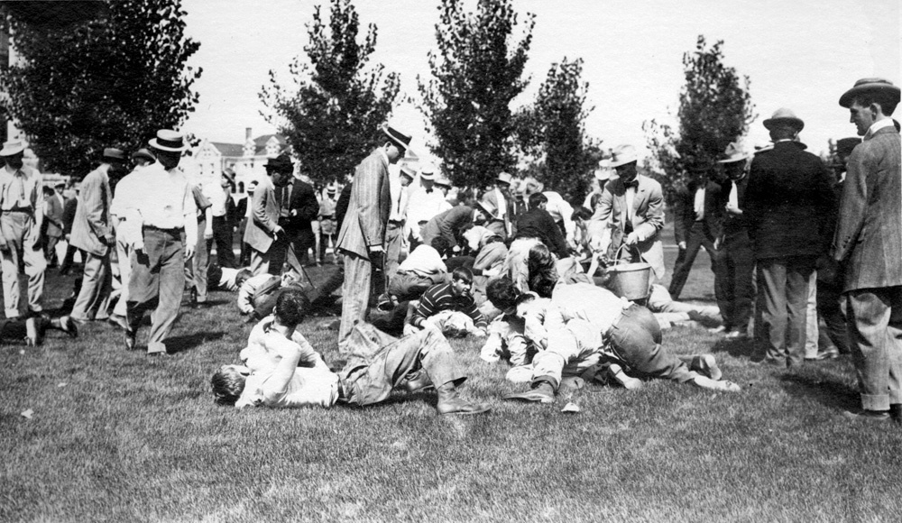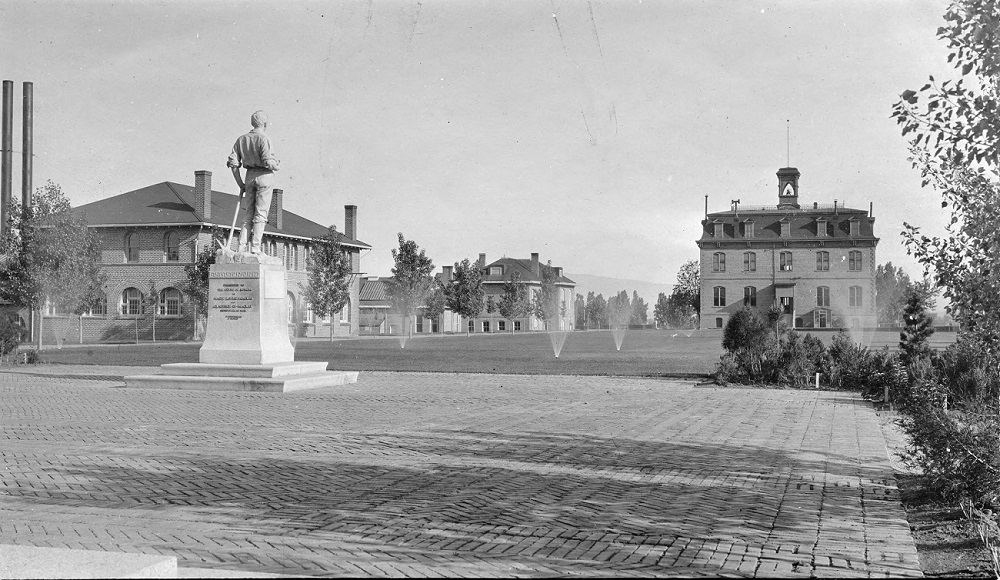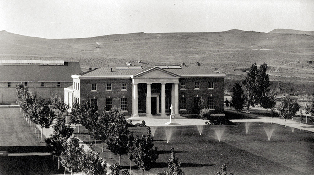 The University of Nevada’s historic quad was not an original component of the campus, but has long been recognized as its most picturesque. The expansive space, measuring roughly 200 x 600 feet, was created in conjunction with the construction of the Mackay School of Mines building in 1908. University President J.E. Stubbs recommended that the new quadrangle created between the rear of Morrill Hall on the south and the new Mines building to the north should be “fitted up with trees and a lawn.”