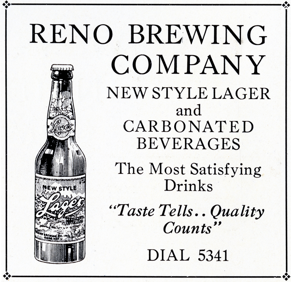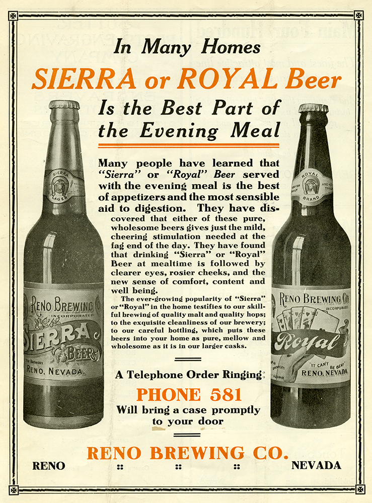 As the tee-totaling temperance movement gained momentum, the company began to promote its beer as a healthy, even medically beneficial, beverage. Unlike many of the state’s other breweries, which shut down permanently during Prohibition, the Reno Brewing Company sailed through by cleverly redirecting its equipment to manufacture near-beer, soda water, seltzers, tonics, and fruit-flavored soft drinks.