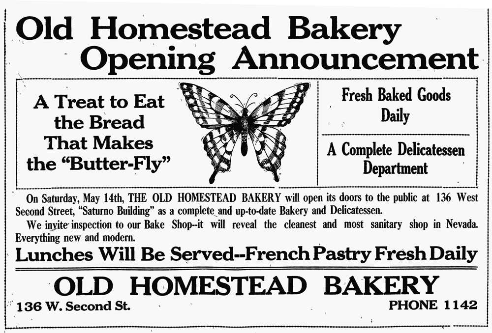 Old Homestead Bakery, 1910 ID: 1051 | This file appears in: Senator Hotel: Built by Pietro Saturno, the three-story 1907 hotel is one of the area's oldest commercial buildings. An early tenant, the Old Homestead Bakery served lunch and pastries daily. Through the years, a number of bakeries, cafes, and bars operated in the building. | Date: May 12, 1910 | Source: Reno Evening Gazette Download Original File SourceReno Evening GazetteDateMay 12, 1910 "Old Homestead Bakery, 1910" appears in: Senator Hotel: Built by Pietro Saturno, the three-story 1907 hotel is one of the area's oldest commercial buildings.