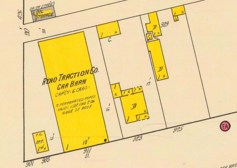 As shown on the Sanborn fire insurance map from 1918, the Reno Traction Company car barn, on the northeast corner of Morrill Avenue and East 4th Street, was a wood frame structure (represented by yellow) with a capacity for six cars. | Creator: Sanborn Fire Insurance Company | Date: 1918 | Source: U.S. Library of CongressDownload Original File