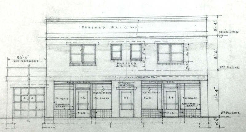 The drawings completed by the architecture firm of DeLongchamps and O'Brien detailed the materials to be used for the Solari Store and Apartments: pressed brick, tile below the display windows, and boxes for awnings to be installed above. The center door opened to stairs leading to the upstairs apartments. | Creator: DeLongchamps and O'Brien | Source: Special Collections, University of Nevada, Reno LibrariesDownload Original File