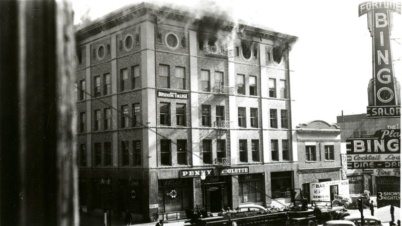 Fire, 1945 ID: 1623 | This file appears in: E.C. Lyons Building: Built for the Odd Fellows in 1908, the five-story building lost its two top floors in a 1945 fire. A devastating fire destroyed the building's top two floors in 1945. | Date: 1945 | Source: Special Collections, University of Nevada, Reno Libraries Download Original File SourceSpecial Collections, University of Nevada, Reno Libraries Date1945 "Fire, 1945" appears in: E.C. Lyons Building: Built for the Odd Fellows in 1908, the five-story building lost its two top floors in a 1945 fire.