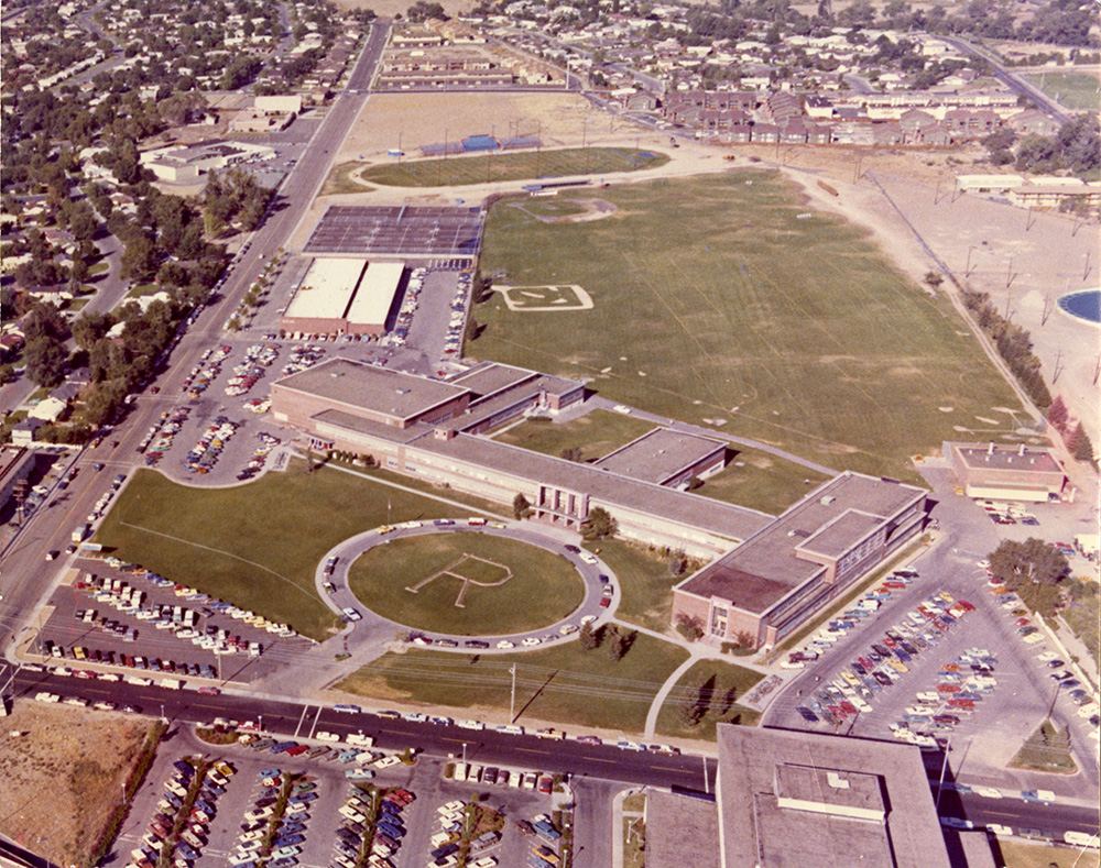 The unfinished area at the top of the photo to the west of the football field was intended for a full size baseball diamond with spectator stands. The "R" was put in by the students but it can only be seen from the air.