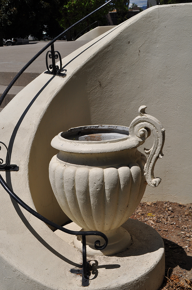 First Church of Christ, Scientist/Lear Theater, entry stair rail with empty urn, 2010. | Creator: Sam Brackstone | Date: 2010 | Source: Paul Revere Williams Project, University of MemphisDownload Original File