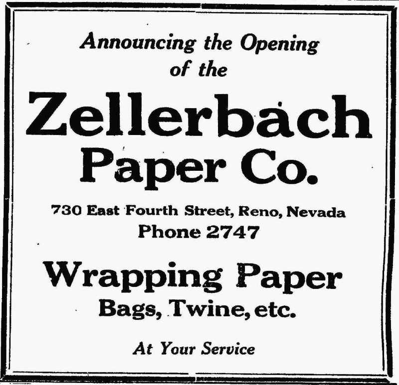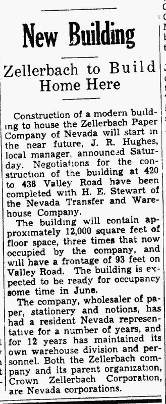 On the block’s west side, facing what was then called “Surprise Valley Road” (later shortened to just "Valley Road") Harry E. Stewart--who served twice as Reno’s mayor, in terms separated by 20 years--had run the Nevada Transfer and Warehouse Company for years. In 1939, he constructed a brick building next door to his warehouse for the Reno branch of the Zellerbach Paper Company, a wholesaler of paper, stationery, and notions with headquarters in San Francisco.